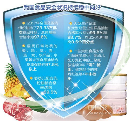 備受消費者關(guān)注的嬰幼兒配方食品合格率又有提高。數(shù)據(jù)顯示,2017年嬰幼兒配方乳粉抽檢合格率為99.5%,比2016年提高0.7個百分點,不合格項目主要集中在標簽標識方面。此外,過去比較突出的食品安全問題也在逐步減少。2017年“超范圍、超限量”使用食品添加劑的問題比上年下降了0.6個百分點。同時,非法添加非食用物質(zhì)問題也逐步得到遏制,比如,嬰幼兒配方乳粉中的三聚氰胺,相關(guān)部門已連續(xù)9年“零”檢出;蛋制品中的蘇丹紅,也連續(xù)4年沒有檢出。