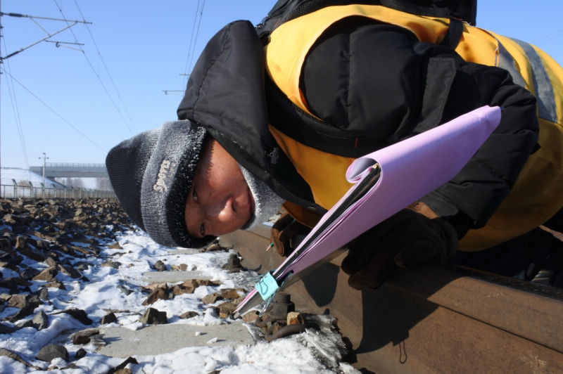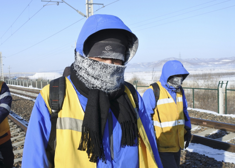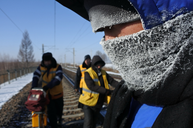 1月23日,在黑龍江尚志市亞布力鎮(zhèn)濱綏鐵路沿線,哈爾濱鐵路局牡丹江工務(wù)段工作人員進(jìn)行鐵軌探傷作業(yè),他的圍巾和帽子上結(jié)著霜花。
