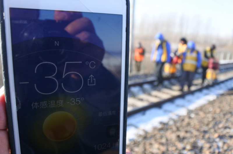1月23日,在黑龍江尚志市亞布力鎮(zhèn)濱綏鐵路沿線,哈爾濱鐵路局牡丹江工務(wù)段工作人員巡檢鐵路。手機(jī)應(yīng)用顯示當(dāng)時體感溫度為零下35攝氏度。
