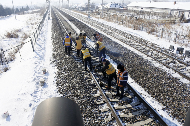 1月23日,在黑龍江尚志市亞布力鎮(zhèn)濱綏鐵路沿線,哈爾濱鐵路局牡丹江工務(wù)段工作人員養(yǎng)護(hù)鐵路。