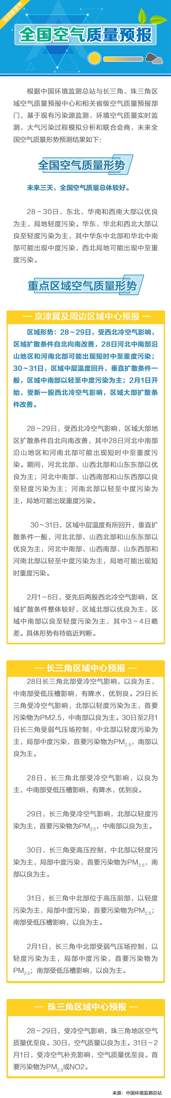 據(jù)環(huán)境保護(hù)部宣傳教育司官方微博“環(huán)保部發(fā)布”消息,未來三天(1月28-30日),全國空氣質(zhì)量總體較好。