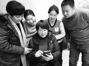 高衛(wèi)華(中間坐者)和昔日的同事看春晚的網(wǎng)上留言。 本報記者 石英杰 攝