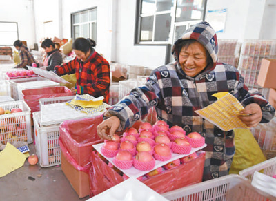 村民正在山東省蒙陰縣宗路果品專業(yè)合作社進行水果裝箱。由于“四好農(nóng)村路”的建設(shè),當?shù)剞r(nóng)產(chǎn)品終于可以通過公路走出大山了。