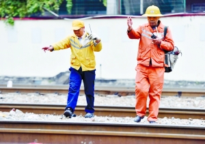每天7:30至11:30和13:30至17:30,巡線工葉張平都要與勞務工王建安巡查廣州站整個站場線路設備。他們仔細“掃描”站場每條股道、每組道岔,讓股道上松散缺等零配件和安全隱患無處藏身。他們平均每天來回得行走16公里,一年下來要走4224公里。