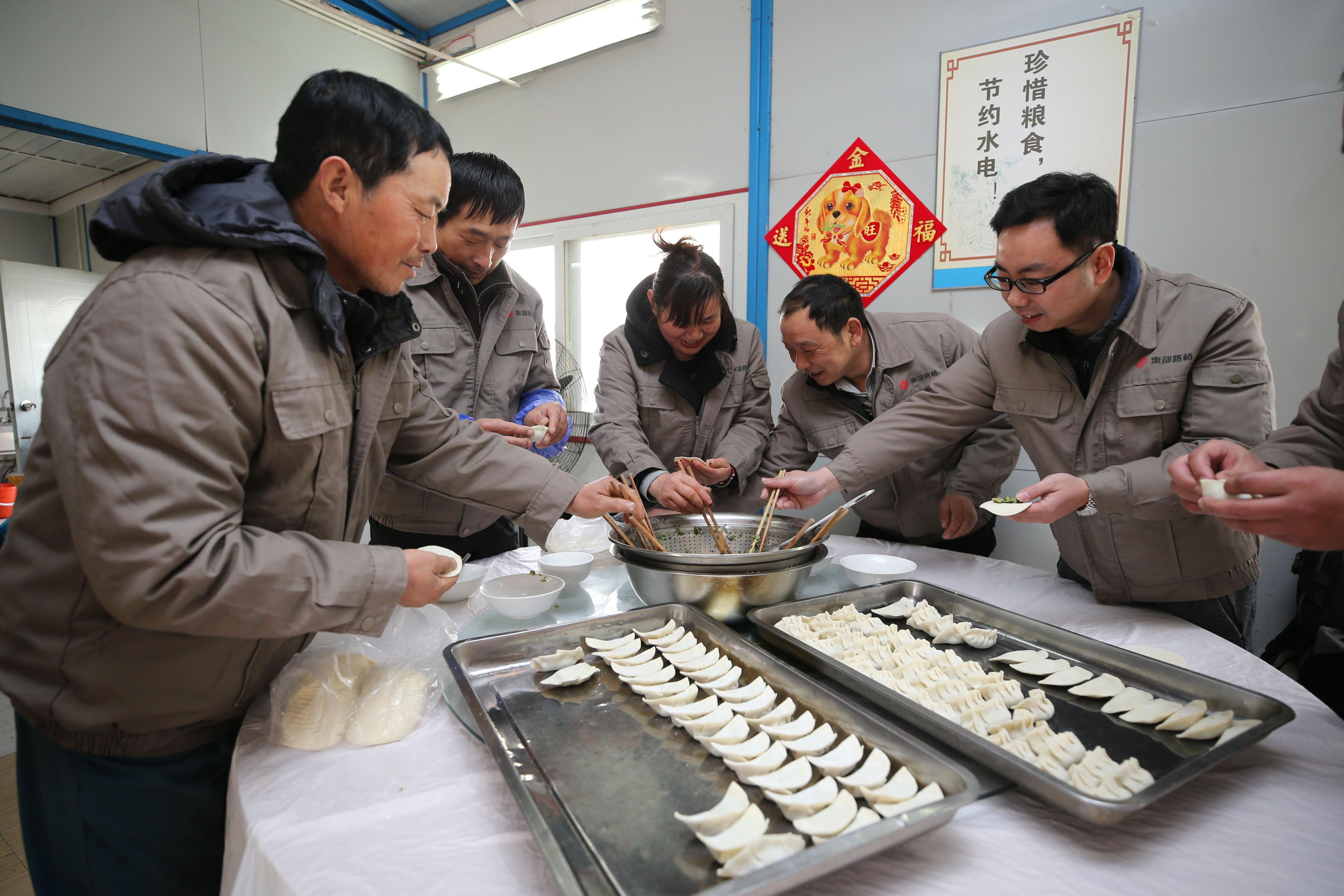 為了讓留守人員感受到過年的氣氛,南京市交通運輸局公路處組織大家在工地包餃子、貼春聯(lián),還準備紅燒肉、雞湯、魚、蝦,讓大家吃上豐盛的除夕大餐。