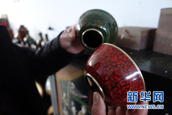 “流淌漆”技藝制作的花瓶。“流淌漆”即通過變換液態(tài)漆的濕度及流下的角度,使之形成自然的漆面花紋。新華網(wǎng) 卓越 攝