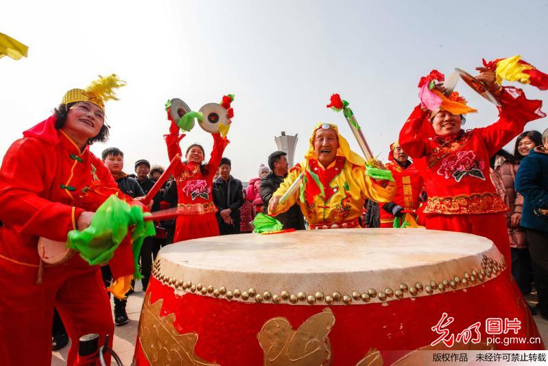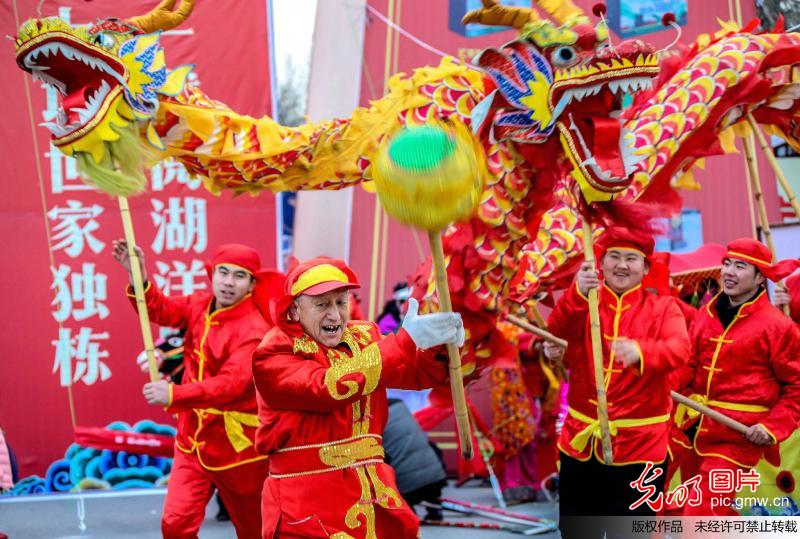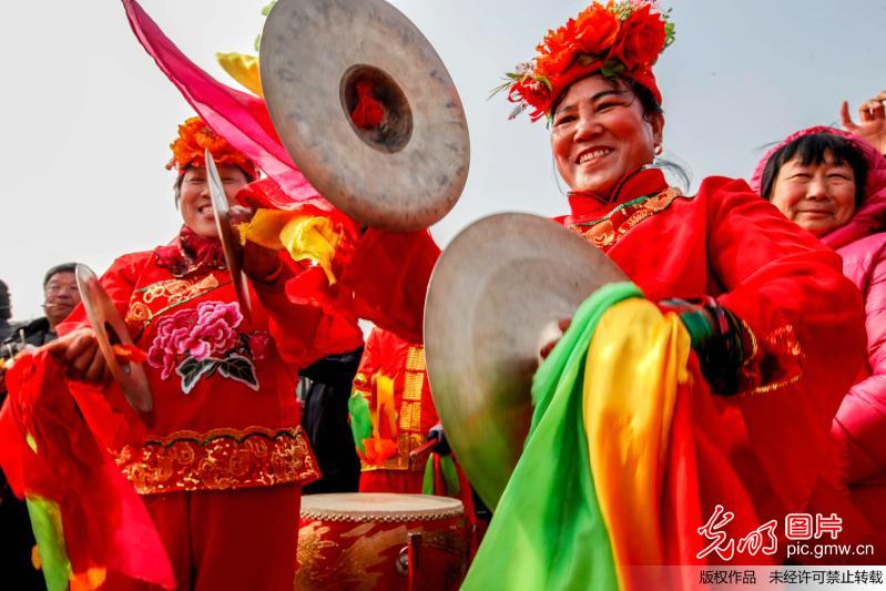 2018年2月24日,山東省青島膠州市的民間藝人在板橋鎮(zhèn)表演舞龍、耍獅子和扭秧歌。