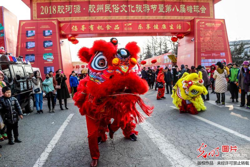 2018年2月24日,山東省青島膠州市的民間藝人在板橋鎮(zhèn)表演舞龍、耍獅子和扭秧歌,為正月里的街市和父老鄉(xiāng)親們帶來了無盡的歡樂。