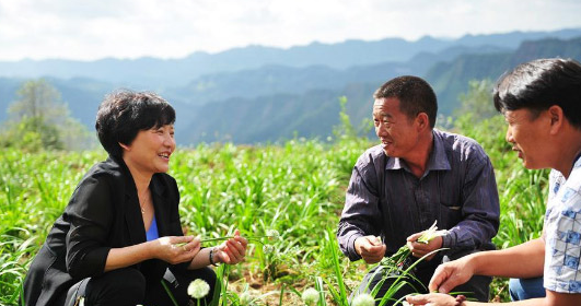 余留芬(左)在巖博村的韭菜地里與村民交流明年的種植計劃(10月9日攝) 。新華社記者陶亮攝