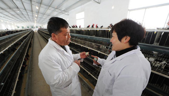 余留芬(右)在巖博村種雞養(yǎng)殖場向工作人員了解養(yǎng)殖場生產情況(2014年1月14日攝)。新華社記者陶亮攝