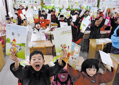 2月25日,在江蘇省連云港市實驗學校一年級2班,學生們在展示剛剛發(fā)放的新學期新課本。 耿玉和攝(新華社發(fā))