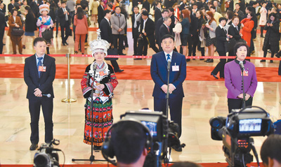 5日,全國人大代表左香云、楊昌芹、鞏保雄、郭鳳蓮(從左至右)在“代表通道”接受采訪! ∥唐嬗饠z(人民視覺)