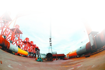 江蘇南通藍島海洋工程有限公司員工吊裝風(fēng)力發(fā)電鋼管樁。新華社發(fā)
