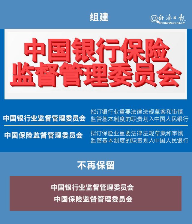 根據(jù)方案,將組建中國銀行保險(xiǎn)監(jiān)督管理委員會(huì),不再保留銀監(jiān)會(huì)、保監(jiān)會(huì)。