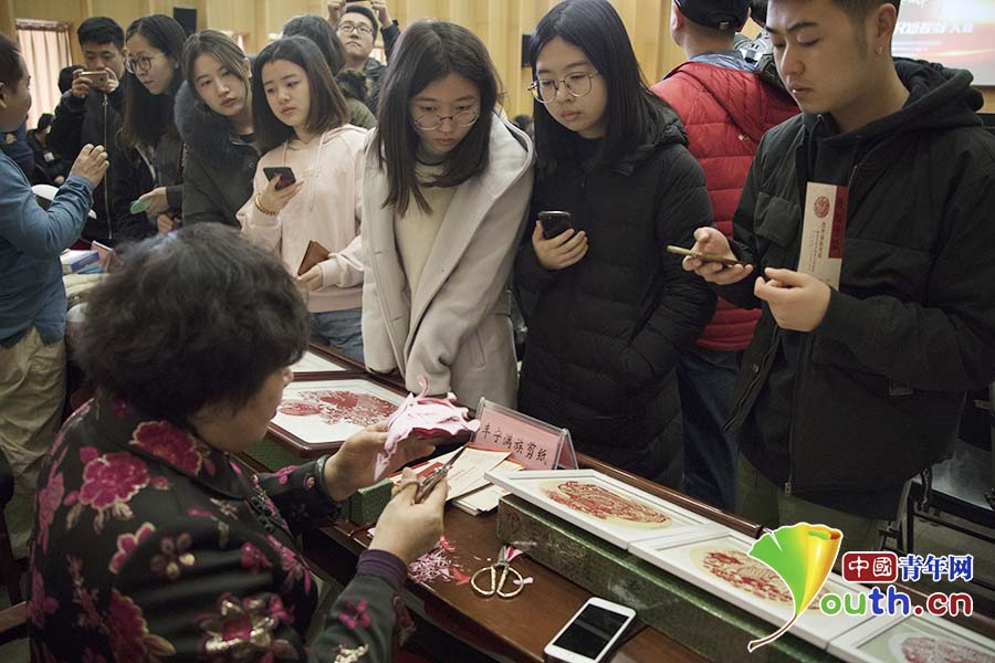 非遺展演環(huán)節(jié),非物質(zhì)文化遺產(chǎn)傳承人現(xiàn)場教學,青年朋友們踴躍參與。中國青年網(wǎng)見習記者陳馨怡攝