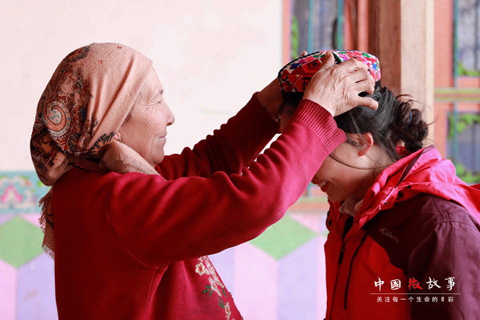 得知尹晶晶年底就要離開村子返回烏魯木齊了,慈祥的熱比古麗老人捧出一頂嶄新的“多帕”(小花帽)親手給尹晶晶戴上,再三囑咐一定要;貋砜纯此齻。