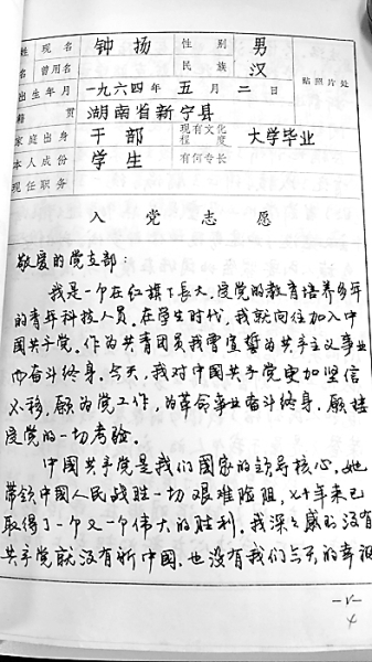 鐘揚的入黨志愿書。復(fù)旦大學(xué)供圖