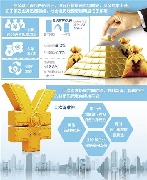 各方對降準(zhǔn)的呼聲由來已久。尤其是在金融監(jiān)管趨嚴(yán)的形勢下,銀行存款增速大幅放緩、資金成本上升,加上影子銀行業(yè)務(wù)迅速萎縮,社會融資規(guī)模增量明顯低于預(yù)期。今年一季度,社會融資規(guī)模增量為5.58萬億元,比上年同期大幅減少1.33萬億元。今年3月末,廣義貨幣(M2)增速為8.2%,M1增速為7.1%,信貸增速為12.8%,存貸款增速缺口不斷拉大。