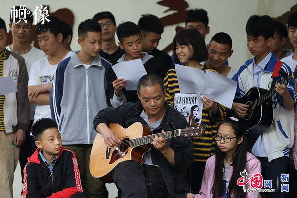 2018年4月,成都雙流安康家園,孩子們和胡源忠合唱《安康》。中國網(wǎng)記者 陳維松 攝