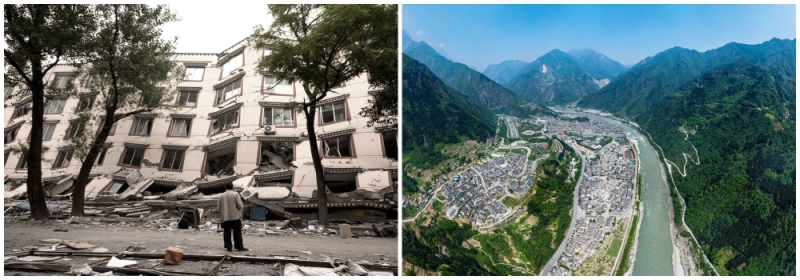 2008年5月20日,四川映秀,一男子在看一幢被地震嚴(yán)重摧毀的房子。2018年4月18日,地震十年之后,目前的映秀鎮(zhèn)。(圖源:新華網(wǎng))