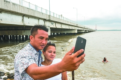 橫跨印度尼西亞爪哇島與馬都拉島的泗馬大橋由中國路橋工程有限責(zé)任公司承建。4月23日,一對情侶在泗馬大橋前合影留念。新華社發(fā)