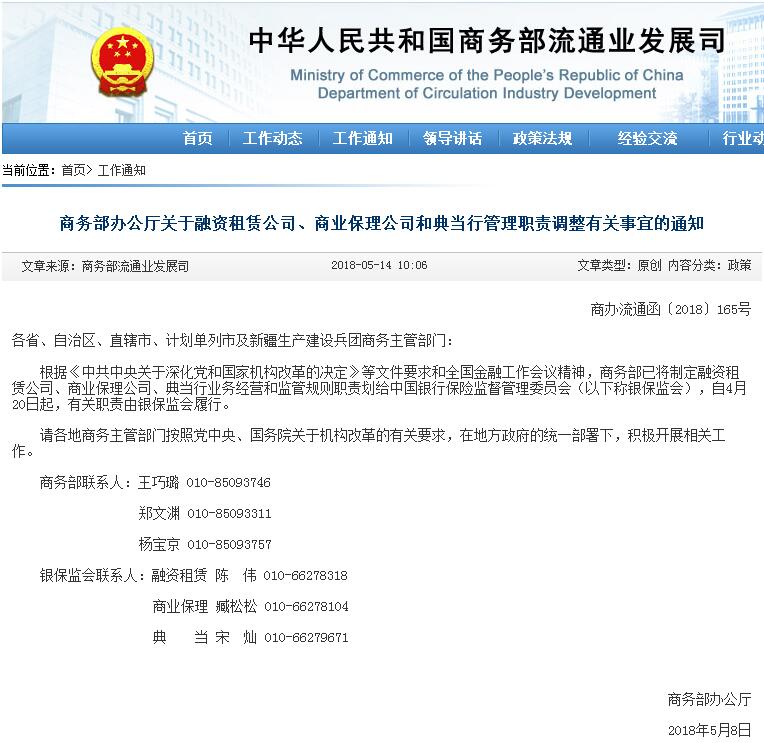 人民網(wǎng)北京5月14日電 據(jù)商務(wù)部官方網(wǎng)站消息,商務(wù)部辦公廳發(fā)布通知,已將制定融資租賃公司、商業(yè)保理公司、典當(dāng)行業(yè)務(wù)經(jīng)營(yíng)和監(jiān)管規(guī)則職責(zé)劃給中國(guó)銀行保險(xiǎn)監(jiān)督管理委員會(huì),自4月20日起,有關(guān)職責(zé)由銀保監(jiān)會(huì)履行。
