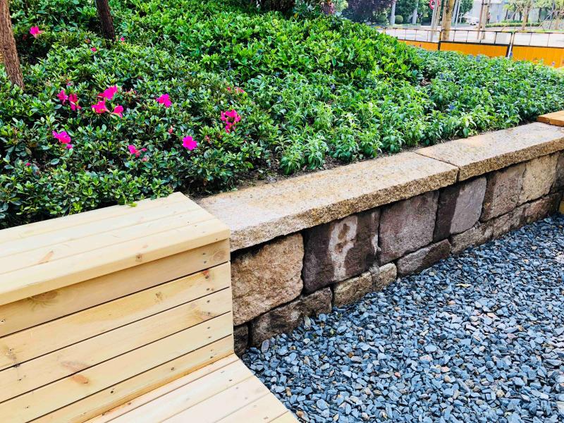 在徐匯中環(huán)綠廊內(nèi),一些供市民休息的座椅、綠化帶圍墻也有不少設(shè)計巧思融入了“海綿城市”理念。如利將細小的碎石通過壘石的方法稍稍抬高綠化帶前的地面,小石子路面不僅比普通水泥地更具親和力,還具備透水功能。部分綠化帶的低矮圍墻逐漸向上傾斜,這也并非刻意營造的幾何形態(tài),而是尊重中環(huán)高壓線下地塊原有的地形特色,在原來地勢基礎(chǔ)上加以改進,組成綠地高低起伏的視覺體驗。