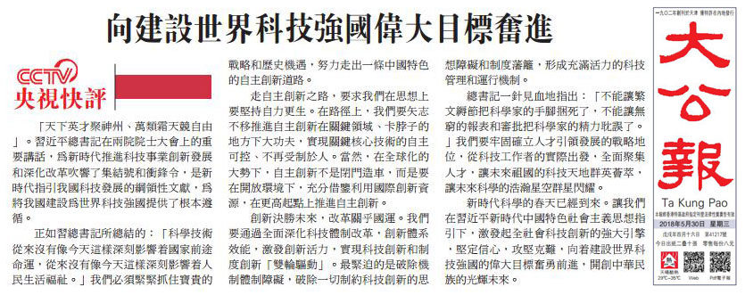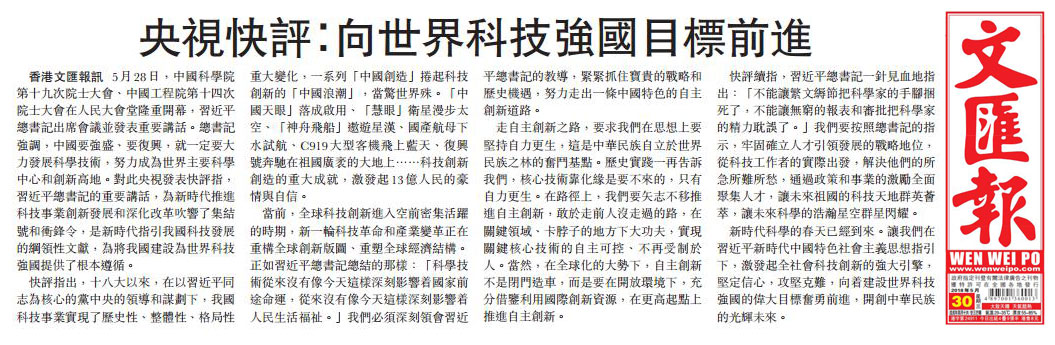 央視網(wǎng)消息:5月30日,香港《大公報》和香港《文匯報》同時轉(zhuǎn)發(fā)了中央廣播電視總臺央視新聞刊播的《央視快評》。文章指出,5月28日,中國科學(xué)院第十九次院士大會、中國工程院第十四次院士大會在人民大會堂隆重開幕,習(xí)近平總書記出席會議并發(fā)表重要講話。總書記強調(diào),中國要強盛、要復(fù)興,就一定要大力發(fā)展科學(xué)技術(shù),努力成為世界主要科學(xué)中心和創(chuàng)新高地。報道內(nèi)容如下: