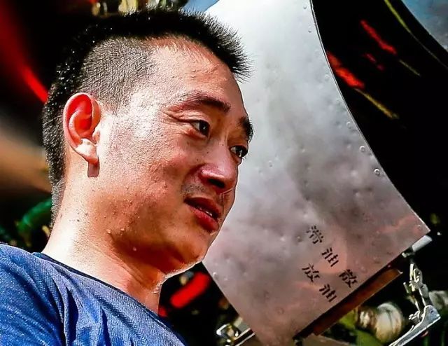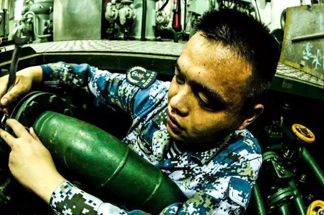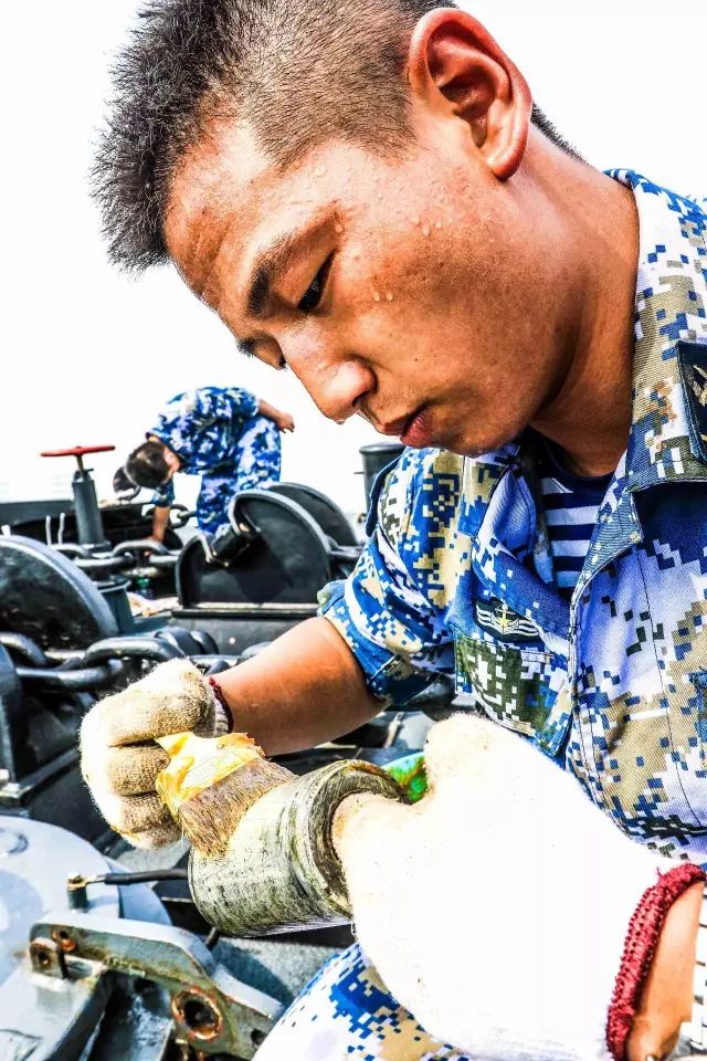 海軍湘潭艦帆纜兵林華斌一手拿著板刷,一手手持裝備,在上銅油,豆大的汗珠掛滿臉龐。