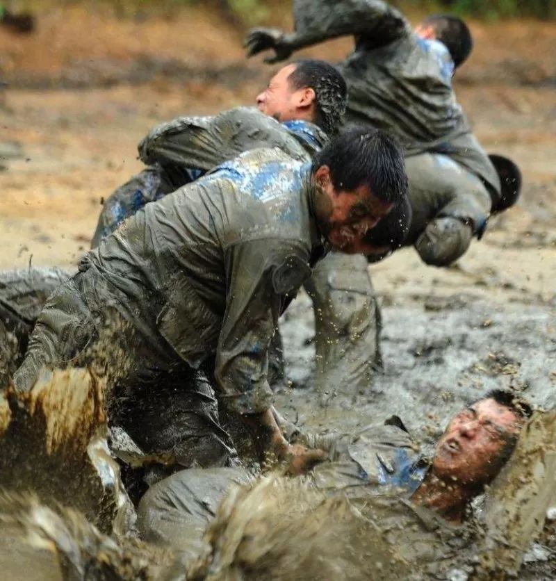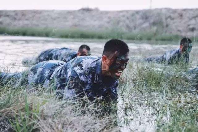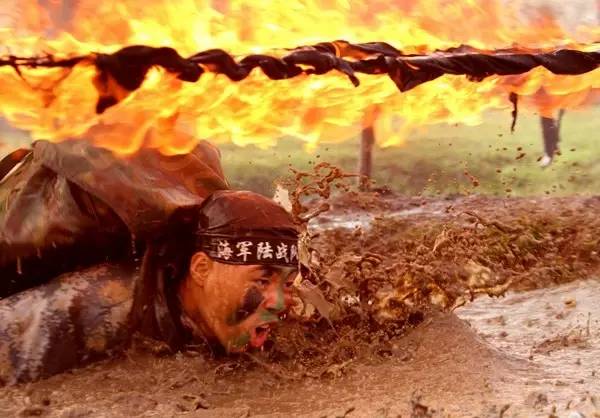 陸戰(zhàn)隊員在泥潭訓練,在陽光的炙烤下,泥潭早已熱浪滾滾。