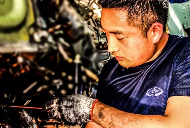 某團機械技師聶衛(wèi)軍維護保養(yǎng)發(fā)動機槳葉,縱然汗如雨下,也全然不顧。