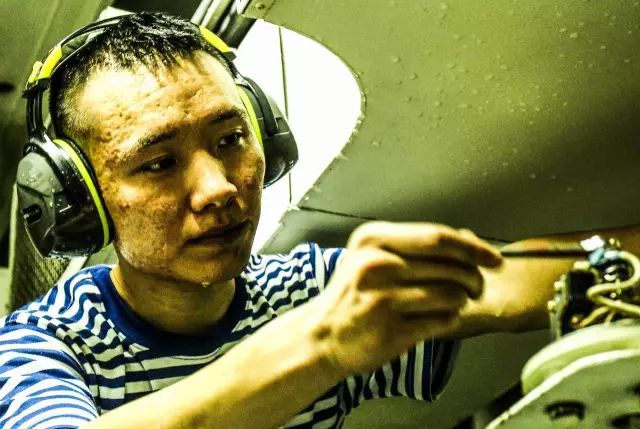 封閉環(huán)境的機艙,某登陸艦大隊嵊山艦副機兵王錦威保養(yǎng)裝備。