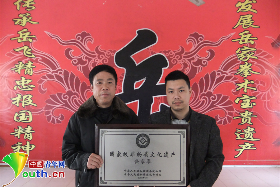2008年,岳家拳正式被國務院批準為國家級非物質(zhì)文化遺產(chǎn)。張業(yè)金(左)與張奇鋼(右)從北京捧回岳家拳非遺匾。