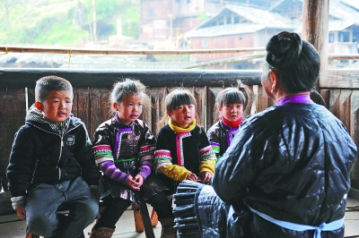 貴州省從江縣小黃村,侗族大歌代表性傳承人潘薩銀花在傳習(xí)所中教小朋友學(xué)唱侗族大歌。賴(lài)鑫琳攝 光明圖片/視覺(jué)中國(guó)