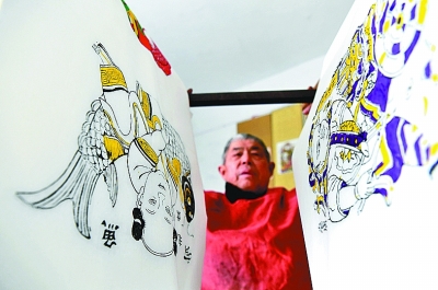 河南省開(kāi)封市朱仙鎮(zhèn),年畫(huà)藝人尹國(guó)全在晾曬年畫(huà)。新華社發(fā)