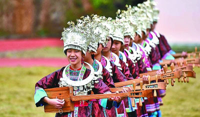 廣西三江侗族自治縣聘請(qǐng)民間師資到校開(kāi)設(shè)“非遺學(xué)堂”,豐富中小學(xué)生文化生活,促進(jìn)非遺技藝代代相傳。圖為學(xué)生們?cè)趶棾弊迮酶。新華社發(fā)