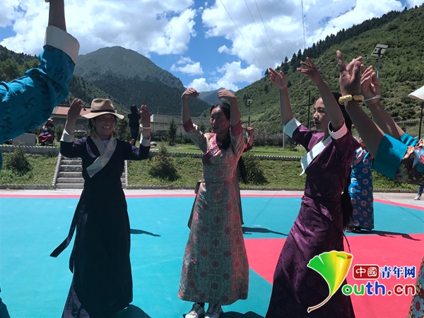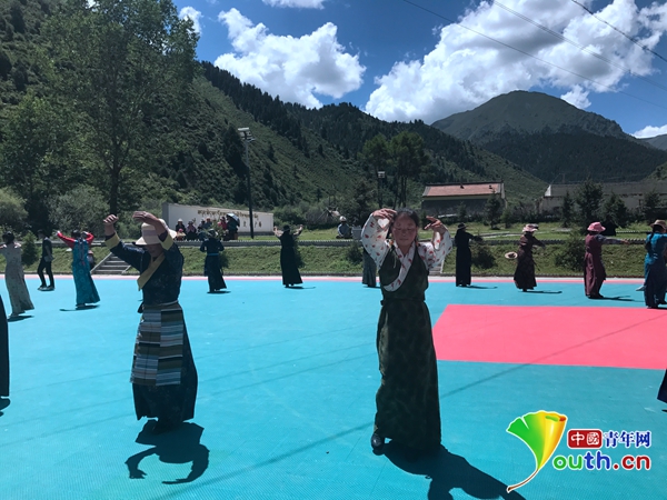 藍(lán)天白云,綠水青山,身著民族服裝的村民在美麗的大自然中用舞蹈表達(dá)對(duì)美好生活的熱愛(ài)。中國(guó)青年網(wǎng)記者 張瑞宇攝