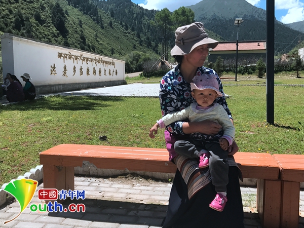 藏民抱著小孩在廣場(chǎng)上看跳舞。中國(guó)青年網(wǎng)記者 張瑞宇攝