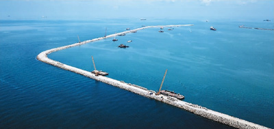 2018年4月28日在馬來(lái)西亞關(guān)丹港新深水碼頭拍攝的防波堤。為配合馬中關(guān)丹產(chǎn)業(yè)園區(qū)的發(fā)展,為入園項(xiàng)目提供優(yōu)良的港口物流服務(wù),廣西北部灣國(guó)際港務(wù)集團(tuán)有限公司入股關(guān)丹港后與馬方合作伙伴一起加快了對(duì)關(guān)丹港的升級(jí)改造。