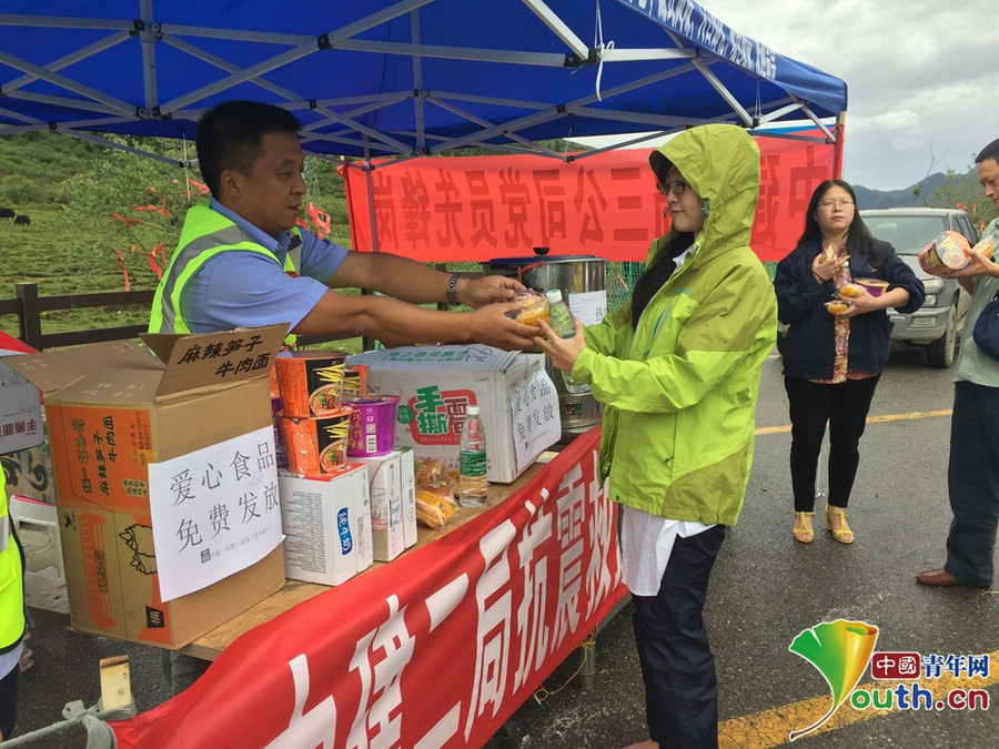震后第二天,得知九寨溝還有大量游客沒有轉(zhuǎn)移,項(xiàng)目部3名黨員立即奔赴九寨溝,在那里設(shè)立了“愛心服務(wù)站”,為受災(zāi)民眾、武警,交警和游客,準(zhǔn)備了足夠數(shù)量的便攜式氧氣瓶、藥品、食品、礦泉水等物資,還特意早早燒好開水,放在保溫桶里。一天里,他們救助近200人次。