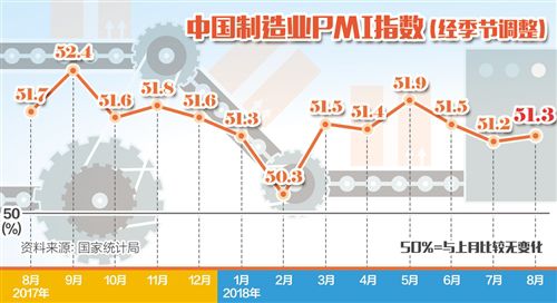 8月份,制造業(yè)PMI為51.3%,比上月上升0.1個百分點,與年均值持平,連續(xù)25個月位于榮枯線以上。今年以來,除春節(jié)月度外,該指數(shù)均在51.0%至52.0%景氣區(qū)間內(nèi)運行,制造業(yè)總體保持平穩(wěn)擴張態(tài)勢。
