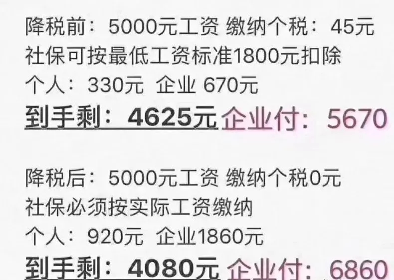 降稅后,繳納個(gè)稅降為0元,然而社保必須按照實(shí)際工資繳納,個(gè)人需要繳費(fèi)920元,這樣一來(lái),到手工資僅剩4080元。
