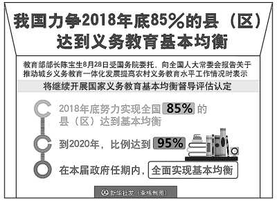 2013年,國家啟動義務(wù)教育發(fā)展基本均衡縣(市、區(qū))督導(dǎo)評估工作。截至目前,全國有2379個縣義務(wù)教育發(fā)展實現(xiàn)基本均衡,占全國總縣數(shù)的81%。上海、北京、天津、江蘇、浙江、廣東、福建、吉林、安徽、山東、湖北等11個。ㄊ校┱w通過評估。隨著教育體制機制改革推進,優(yōu)質(zhì)均衡發(fā)展的新格局不斷拓展。