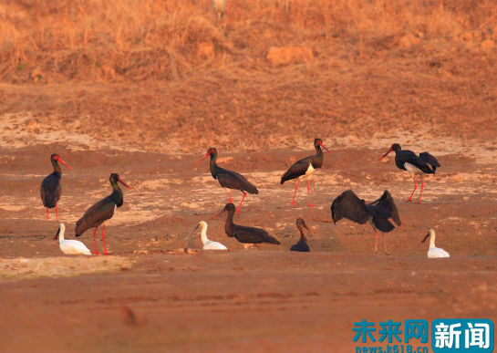 河南省孟津縣黃河濕地國(guó)家級(jí)自然保護(hù)區(qū)內(nèi)的黑鸛(黃河濕地孟津管理局供圖)