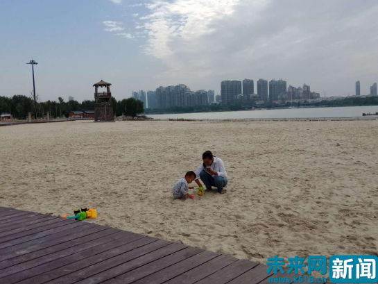 一位年輕的媽媽帶著孩子在沙灘上玩耍。未來(lái)網(wǎng)記者 劉文靜 攝