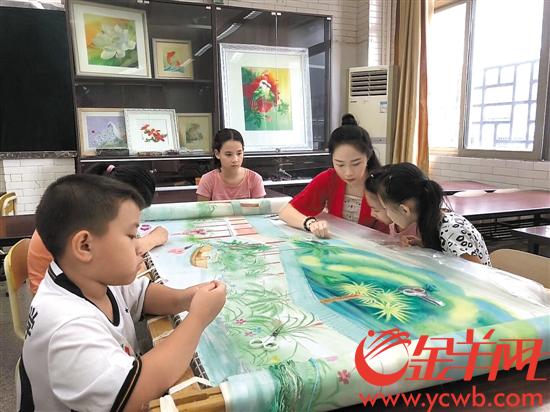 在廣州市荔灣少年宮,一群10歲左右的學(xué)生和一位20來(lái)歲的女孩正圍坐在一幅自然山水繡布前,女孩兩手時(shí)而靈活地穿針引線,時(shí)而放下針線,摸摸孩子們的小腦袋,抓起孩子們的小胖手,細(xì)心細(xì)語(yǔ)地說(shuō):“平常我們都用‘直紋直針’繡,如果要繡水紋,就要用‘稀疏針’了,直的地方保持平衡,波浪的地方就要打斜一點(diǎn)點(diǎn)……”