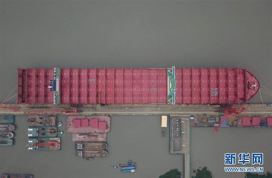 “中遠(yuǎn)海運(yùn)室女座”號(hào)超大型集裝箱船停靠在上海外高橋造船有限公司碼頭(5月30日無人機(jī)拍攝)。 新華社記者丁汀攝
