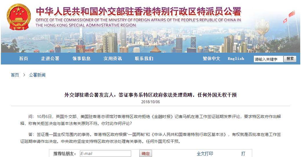 人民網(wǎng)北京10月7日電 據(jù)外交部駐香港特別行政區(qū)特派員公署網(wǎng)站消息,在外交部駐香港特別行政區(qū)特派員公署例行記者會(huì)上,記者問:10月6日,英國外交部、美國駐香港總領(lǐng)館對(duì)香港特區(qū)政府拒絕《金融時(shí)報(bào)》記者馬凱在港工作簽證延期發(fā)表評(píng)論,要求特區(qū)政府作出解釋,稱有關(guān)拒簽決定與基本法有關(guān)原則不符。你對(duì)此作何評(píng)論?