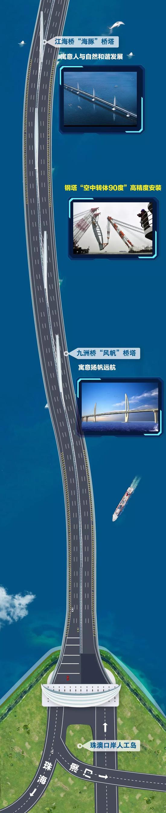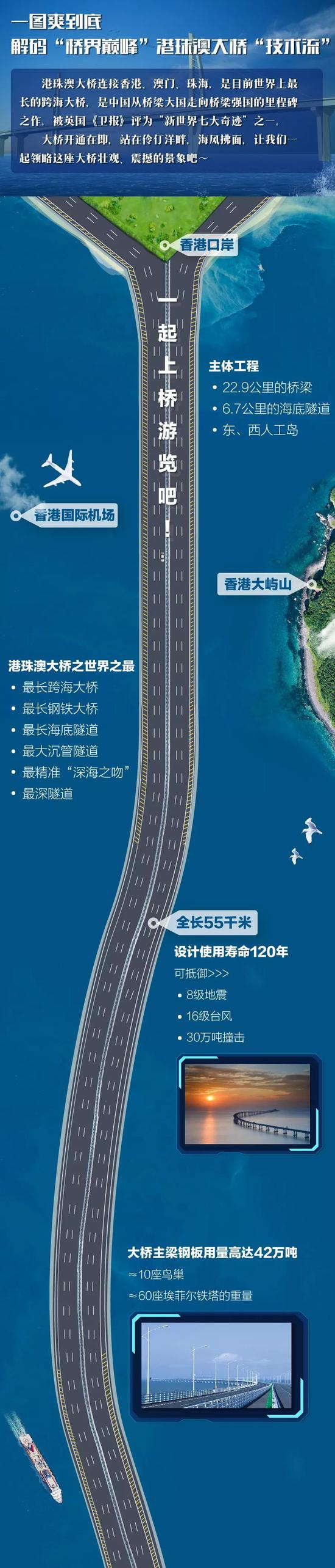 港珠澳大橋連接香港、澳門、珠海,是目前世界上最長(zhǎng)的跨海大橋,是中國(guó)從橋梁大國(guó)走向橋梁強(qiáng)國(guó)的里程碑之作。大橋被英國(guó)《衛(wèi)報(bào)》評(píng)為“新世界七大奇跡”之一。