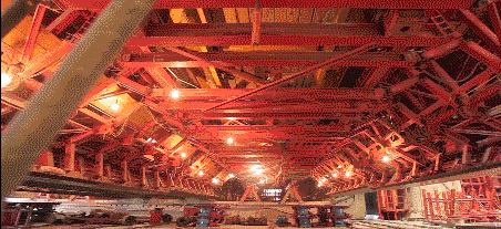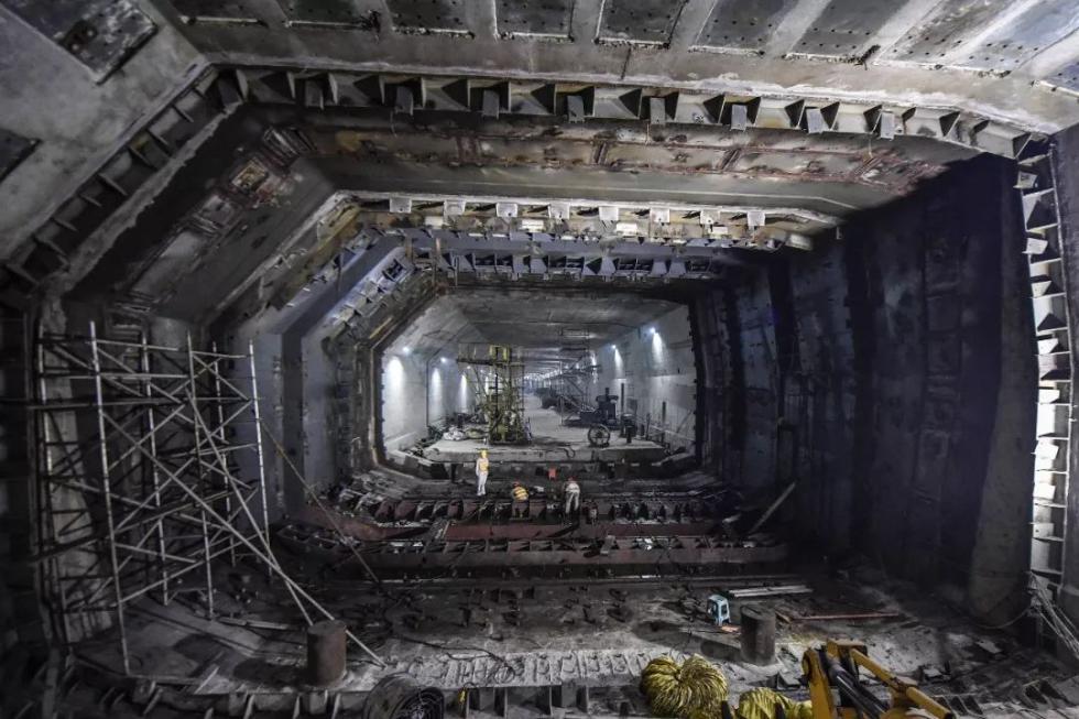 2017年7月7日,港珠澳大橋海底隧道正式貫通。圖為施工人員在港珠澳大橋海底隧道最終接頭處施工。